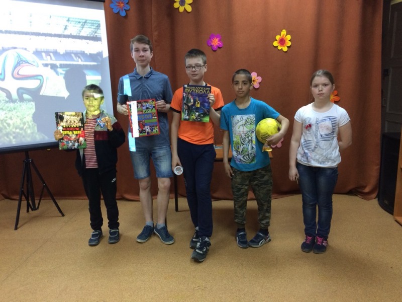 Сотрудники библиотеки познакомили ребят с историей футбольного мяча, вспомнили стихи о мяче и футболе, провели викторину «Библиотечный стадион», а завершился праздник, просмотром лучших российских мультфильмов «Матч-реванш», «Утенок, который не умел играть в футбол» и «Как казаки в футбол играли».