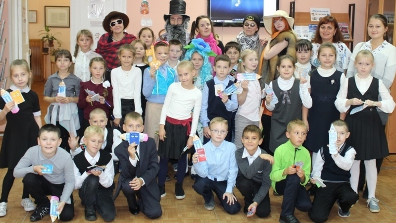 Буратино поздравил всех гостей с победой и началом учебного года, подарил ребятам на память об этом дне книжные закладки, подготовленную специалистами библиотеки, ручки и блокноты.