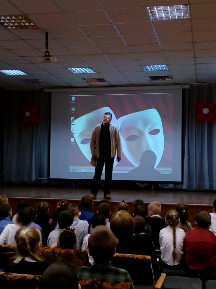 Главными гостями стали артисты Мурманского областного драматического театра Царева Е.В. и Гронский С.В. Они выступили перед учащимися 2 и 3 классов школы с рассказом о жизни театра, прочитали прекрасные монологи и стихи.