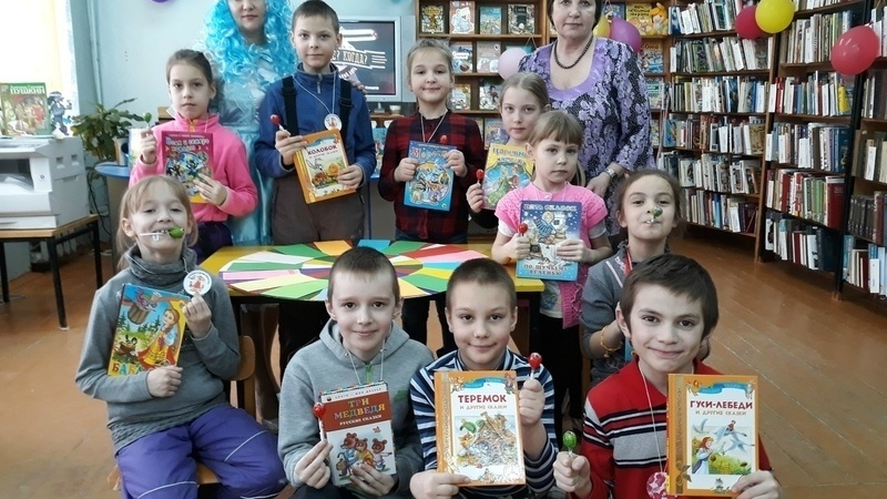 Вместе с библиотекарем и клоуном Почитайкой юные читатели совершили увлекательное путешествие в мир книг – вспомнили пословицы и поговорки о книгах; отгадали сказочных авторов телеграмм; нарисовали с закрытыми глазами Чебурашку, приняли участие в подвижных играх и конкурсах. Вместе с Айболитом дети лечили больных зверей, катались на печи с Емелей, помогли Золушке отделить фасоль от гороха, с Винни Пухом слетали на воздушном шарике за мёдом, а с Красной шапочкой отнесли пирожки бабушке. Закончился праздник награждением самых активных читателей библиотеки.