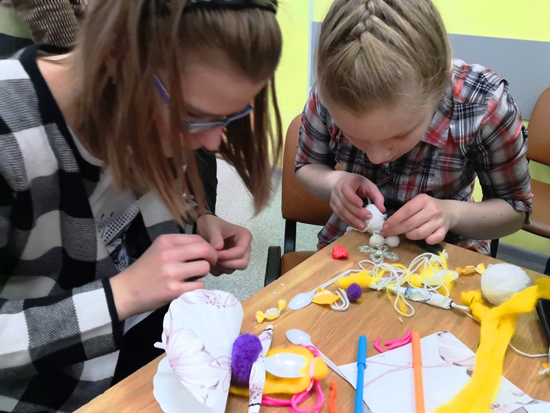 Ребята согласились попробовать себя в роли кукольника. А куклу предстояло сделать самим. Куклы из одноразовых ложек просты в изготовлении, с ними удобно играть, разговаривать и разыгрывать сценки. И работа закипела. В ход пошли нитки, лоскутки ткани, обрезки обоев, синтепон, пластилин, цветные жгутики, все, чем можно украсить ложку. Ребята постарше с работой справились сами, малышам помогали родители. В детских руках ложки превратились в настоящих театральных кукол – котов, медвежат, лисичек, зайцев, принцесс, петрушек и других персонажей. Когда куклы были готовы, юные «кукловоды» поиграли в игру «Все наоборот», и теперь они смогут обыграть с куклами собственного изготовления любую сказку.