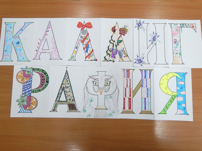Вторая часть конкурса – творческая. Ребята должны были красиво оформить «буквицу» – буквы слова «КАЛЛИГРАФИЯ».