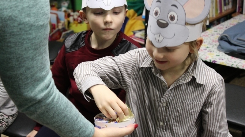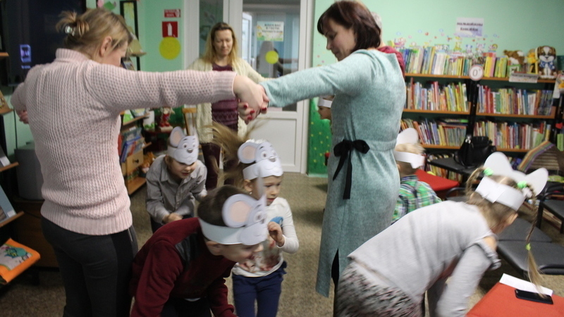 Взрослые и дети вместе сыграли в спектакле истории «Грамотная мышка», весело исполнили песню «Хитрые мышки» и поиграли в игру-данетку «Что любят мышки». Как известно самое любимое лакомство мышей – это вкусный сыр. Для того чтобы получить свой кусочек сыра, дети и родители активно участвовали в танцевальной игре-мышеловке и «Спасите книжную мышку», отгадывали, какие мышки из каких книжек попали в библио-мышеловку. После того, как сыр был продегустирован, участники устроили праздничный фейерверк на планете Мышей. Они хлопали, топали и приседали, выражая свои радостные эмоции.