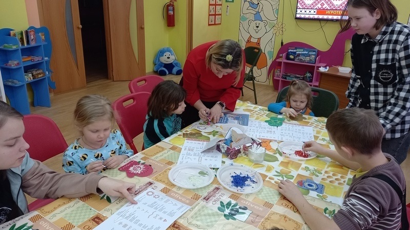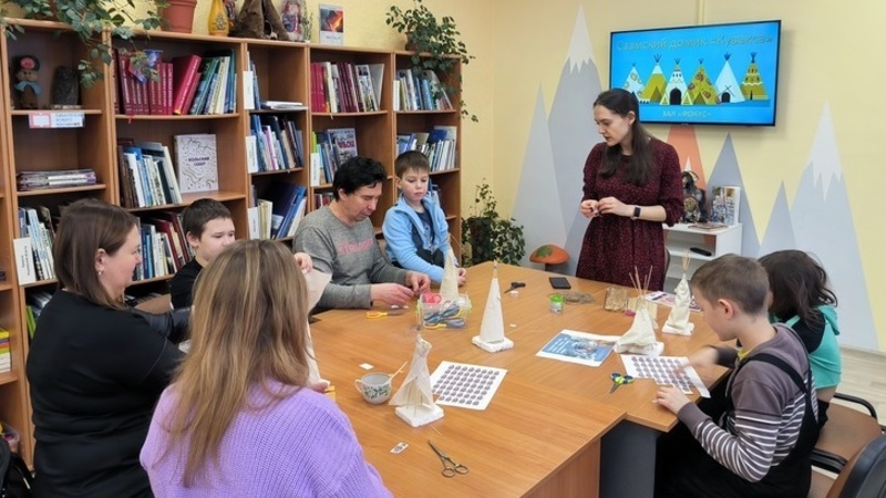После подвижных игр на свежем, морозном воздухе гости встречи отправились в библиотеку, где проходили творческие мастер-классы: саамский домик «Кувакса», олененок «Пыжик» и «саамские узоры». Ребята мастерили жилище саамов, делали олененка в технике «оригами» и разукрашивали бумажные рукавички при помощи акриловых красок и ватных палочек, имитируя вышивку бисером. В гостиной можно было согреться горячим чаем, сфотографироваться в колоритной фотозоне и понаблюдать за северным сиянием под этническую музыку северных народов.