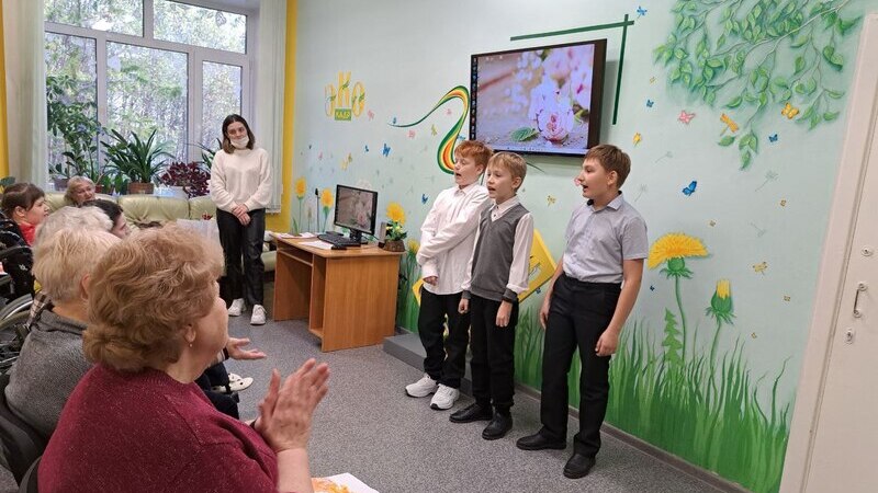 Концертную программу украсили юные гости – ученики 5 Школы 3 «а» класса – Рухлова Есения, Зайцев Олег читали стихи, ученики 5 «а» класса – Завьялов Илья, Попов Артем, Катков Роман исполнили песни «Бабушка и дедушка – самые родные», «Непогода» – песню из к/ф "Мери Поппинс, До Свидания". Школьники не только подготовили выступление, но и пришли с подарками. Ребята подарили гостям мероприятия рисунки, нарисованные специально к празднику, а также различные сладкие угощения.