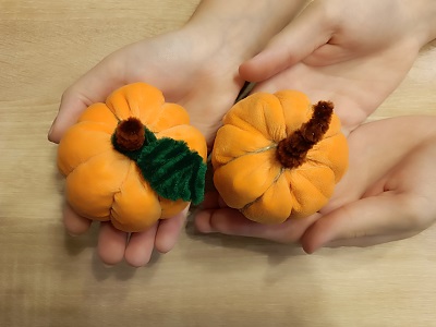 Яркая осенняя тыква в октябре на время стала центром внимания. Во многих культурах по всему миру тыква является символом плодородия, достатка и здоровья. Именно поэтому этот овощ всегда играл важную роль в украшении домов на праздники урожая. Ребята узнали о сортах тыквы, полезных свойствах, посмотрели на фото тыкв-гигантов и удивились их огромному весу, а затем приступили к работе. Для изготовления интерьерной антистресс-поделки понадобилось немного велюра, шпагат, нитки и иголка. Декоративная тыква из ткани не потребовала значительных усилий по её созданию. Достаточно было уметь делать шов «вперед иголку» и завязывать узелок. Текстильная тыква приятна на ощупь, мягка и приятно шуршит наполнителем. Вы спросите, что же там внутри? А внутри в качестве наполнителя выступила обыкновенная гречка!