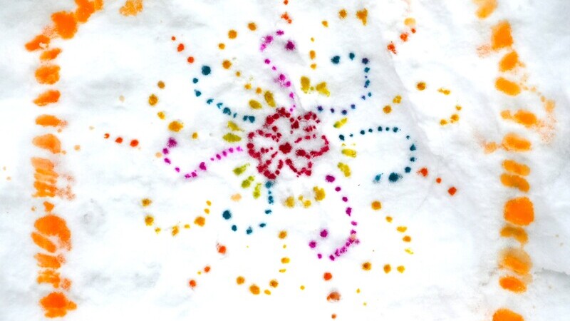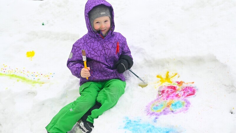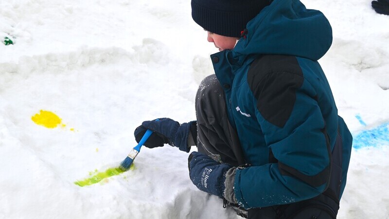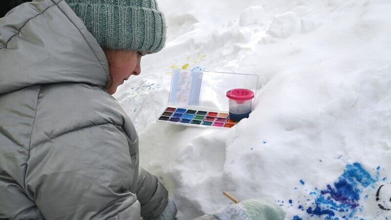 Рисовать на снегу, разумеется, сложнее, чем на бумаге – лучше не водить кистью по листу, а использовать точечную технику. Рисовать линии легче на плотно утрамбованной гладкой поверхности. А также – чем больше в краске воды – тем лучше. Все эти тонкости участники познавали тут же, на собственном опыте, ведь, как выяснилось, рисовать акварелью на снегу зимой им еще не приходилось.