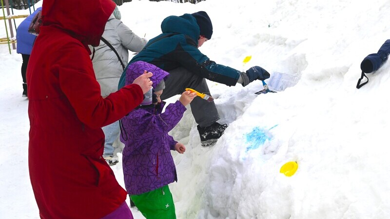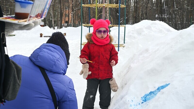 Мамы, дети и подростки, несмотря на порывистый ветер, с азартом принялись за дело. Утром выпал свежий снег, поэтому арт-пространство необходимо было подготовить для творчества. Вооружившись варежками и перчатками, участники мастер-класса тщательно утрамбовали снежный холст – длинный и высокий сугроб в Литературном парке библиотеки. После этого можно было приступать к рисованию.