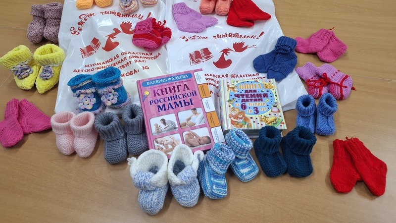 Кроме традиционных подарков, впервые за более, чем двадцатилетнюю историю акции, сотрудникам «дома, где жизнь начинает разбег», были переданы пинетки и носочки, связанные с душевным теплом и добрыми пожеланиями участницами библиотечного клуба «#ПерекрёсткиПоколений». Пусть первая обувка малышей согревает маленькие ножки.